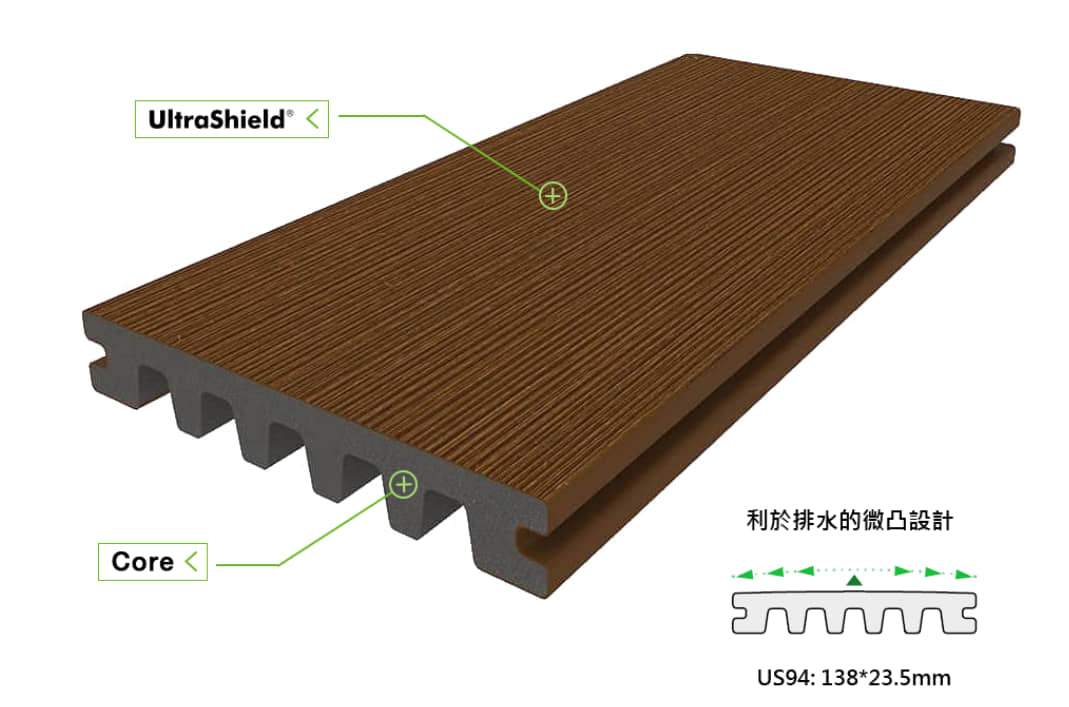 美新塑木的US94地板,既有空心的經濟性,又沒有藏水的隱憂!