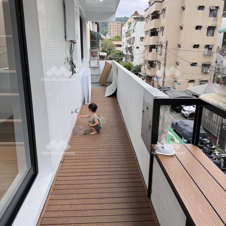位於北市天母的大樓露臺,有著極大的日射量,考驗著NewTechWood的抗褪色性與耐候性,UltraShield技術的保護層是塑木最強大的盾牌,能抵禦風吹雨淋、炎熱高溫等惡劣環境,長期保持美麗的顏色、不變形與極小的尺寸變化率。