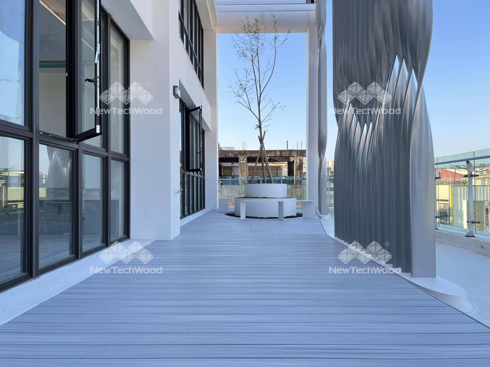 感謝業主及設計師,在新總部大樓的打造中選擇美新塑木「煙灰白」色系,與建築本體的純白立面相互輝映,展現出簡約而現代的空間美學。而穩定耐用、兼具美感,是選擇NewTechWood美新塑木的主因。
