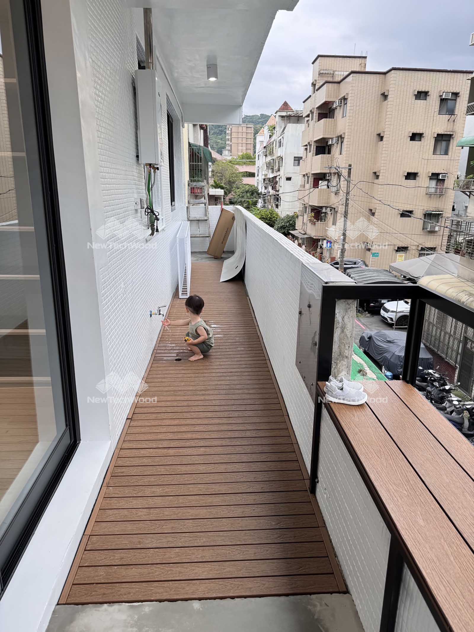 陽台改造|地板、檯面陽台改造|地板、檯面 感謝設計師在本次陽台改造中,選用美新塑木「柚木色快組地板」與「UH02柚木色地板」打造檯面,讓原本老屋陽台煥發自然溫潤的質感。 設計師含設計、材料計算及台面骨架及塑木安裝,都一手包辦,果然是專業中的專業。快組地板的俐落模組設計,搭配各式邊條適應不同寬窄,不僅提升使用機能,更讓陽台成為家中最療癒的角落。 檯面骨架中心距:35cm;外側玻璃 ─────────────────── 檯面材料:UH02柚木色地板 地板材料:30*90快組地板+直邊條 柚木0 Share: