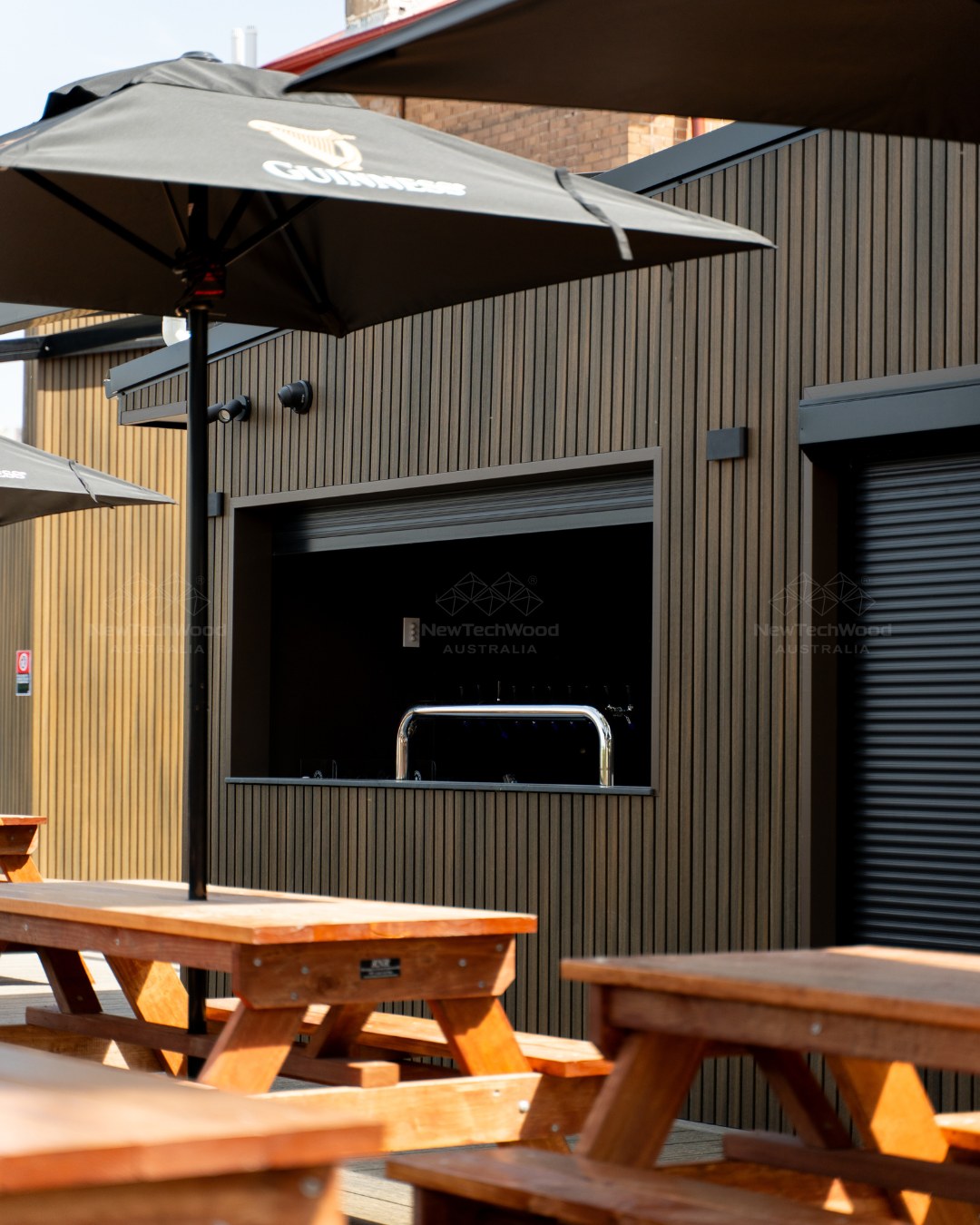 位於澳洲新南威爾斯州的 Riverview Hotel 曾是一個老舊、受風化影響的場地,需要大規模修繕。經由 DKMX Constructions 的改造,原本的停車場被重新設計為 多功能的戶外地板區域,專門服務日常營運。材料選擇在重新設計中扮演關鍵角色。DKMX 的 Daniel 推薦 NewTechWood 在專案中表現、真實感與一致性:「我們合作過許多複合材料品牌,但 NewTechWood 持續表現優於其他品牌。」因為它兼具 耐候性、低維護性與真實木質感,非常適合高頻率使用的場域。DKMX 推薦了 Coastal Decking 風化木系列地板 和 50mm Castellation Cladding(UH58) 的牆板,屋主一看到就愛上了。溫暖且風化的木質外觀、豐富的色調變化與逼真的紋理,呈現團隊所追求的美感,而 NewTechWood 全殼層的防護則提供耐用且低維護的性能,非常適合繁忙的款待場地。