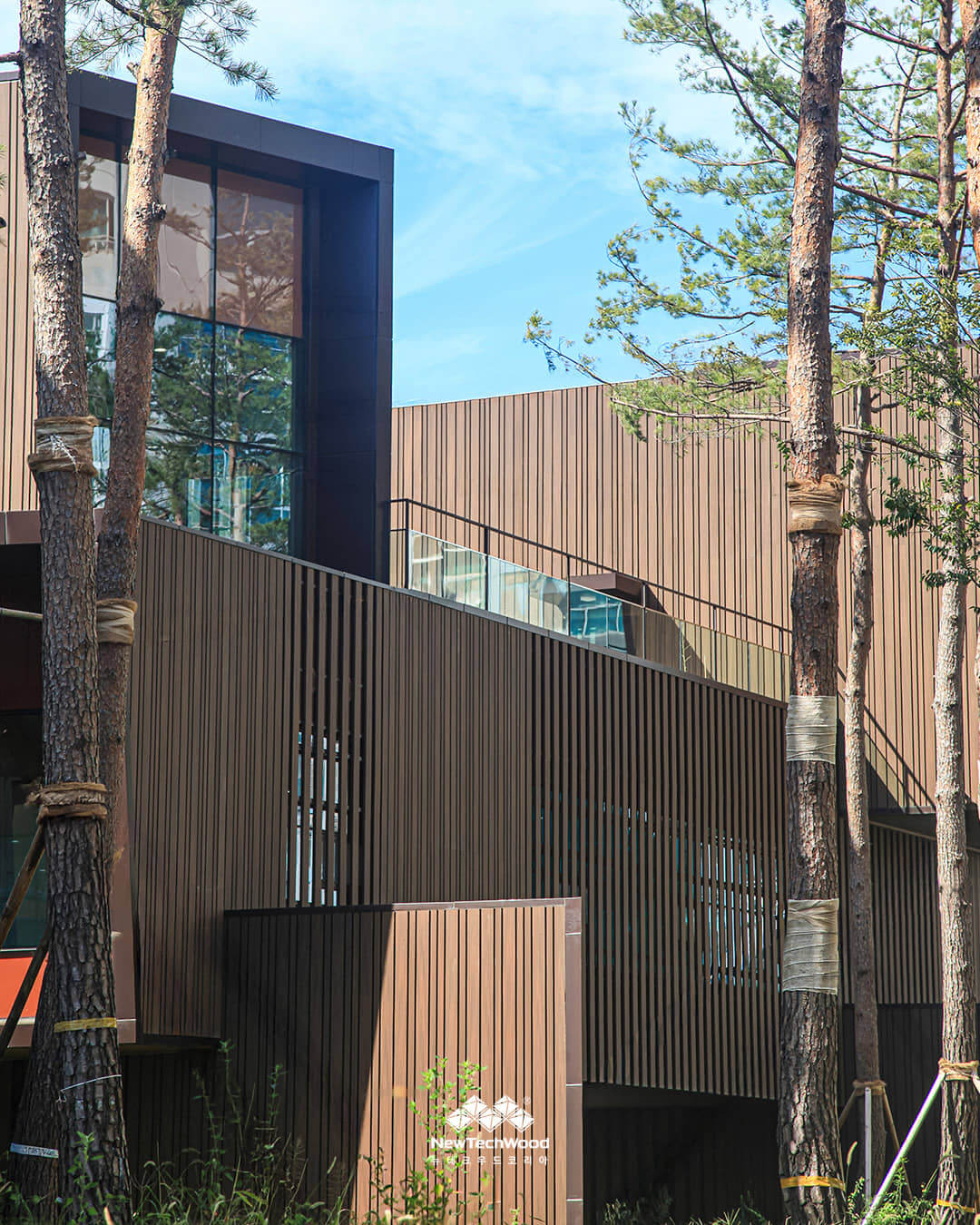 建築外觀全部採用Newtechwood Korea 的 UltraShield 塑木(IPE 色),營造出堅實而溫暖的氛圍。 UH145 和 UH146 兩種型號的外牆板以一定間隔排列,形成富有韻律感的立面,流暢的線條彷彿捕捉到了微風的律動。建築外觀與城市景觀中的自然環境完美融合,進一步提升了松島國際圖書館的形象。