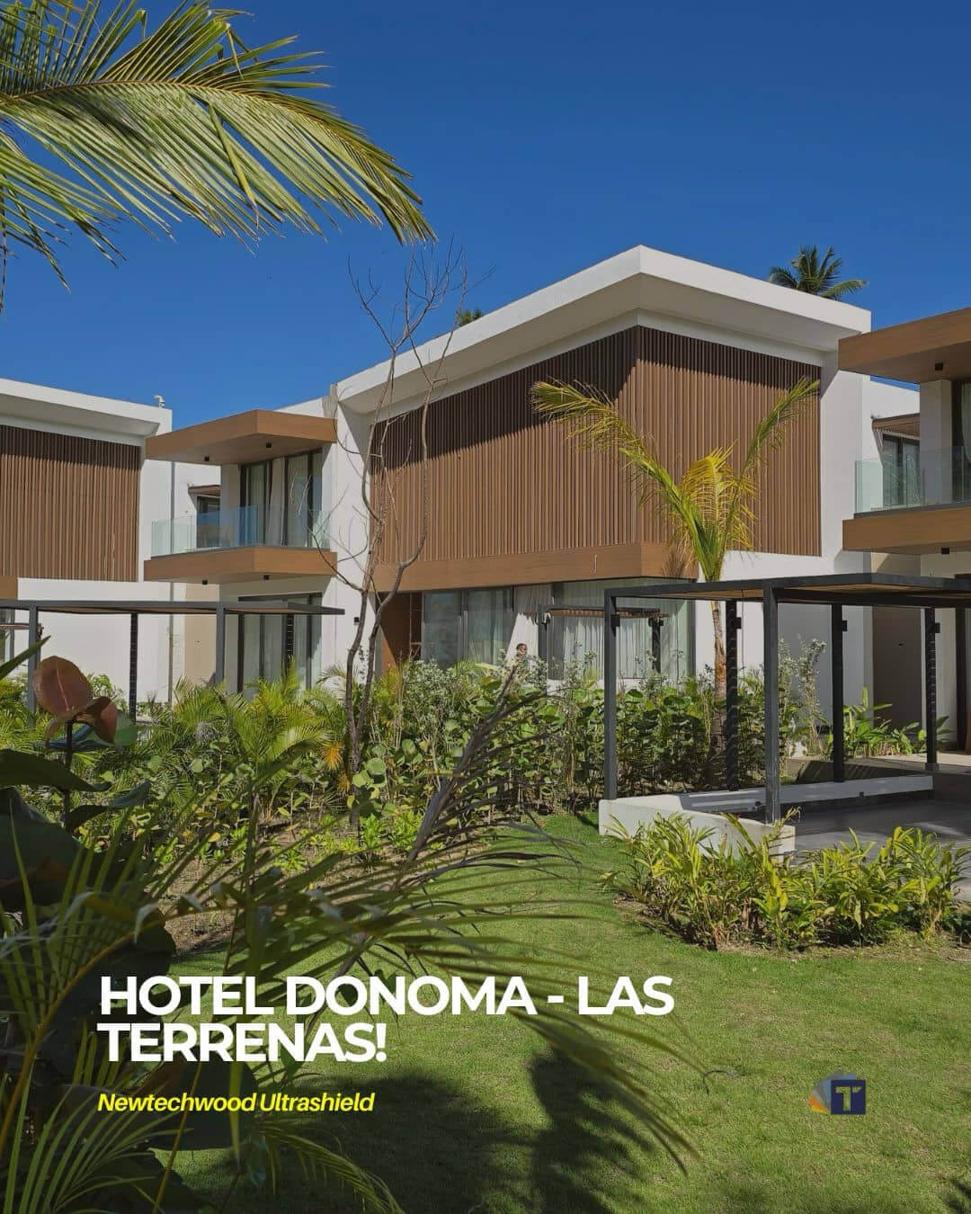 在多諾瑪飯店Hotel Donoma ·Las Terrenas 建築以 NewTechWood UltraShield 塑木包覆與百葉與景觀,專為海岸環境設計。