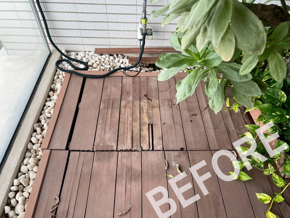 屋主說:「塑木平台久有變形開裂的狀況了,想要拆掉,設計師建議用你們的東西。聽說你們可以設計施工全部包辦!地板上有一盆栽相當大而且很重,你們的建議是那個區域不要鋪?還是如何?我原本想法是那一個區域不要鋪設,因為植物澆水,久了之後,下面的木料還是會潮濕或腐壞。」