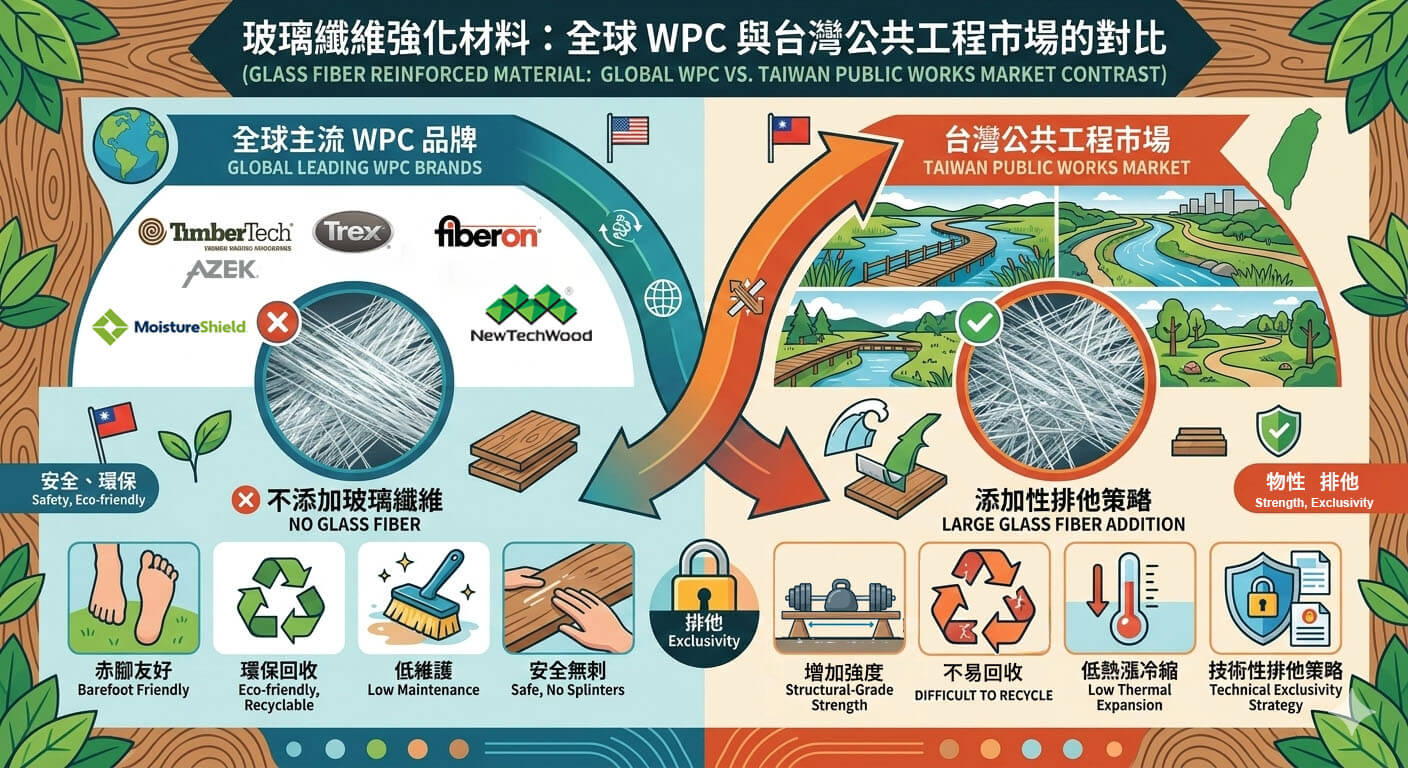 - 與綠色建築認證衝突: 許多美國建案追求 LEED 認證,Trex 等品牌使用 95% 的回收材料(如回收塑膠袋、回收木屑),加入「原生」玻璃纖維會降低回收比例,反而不利於品牌的綠色營銷。