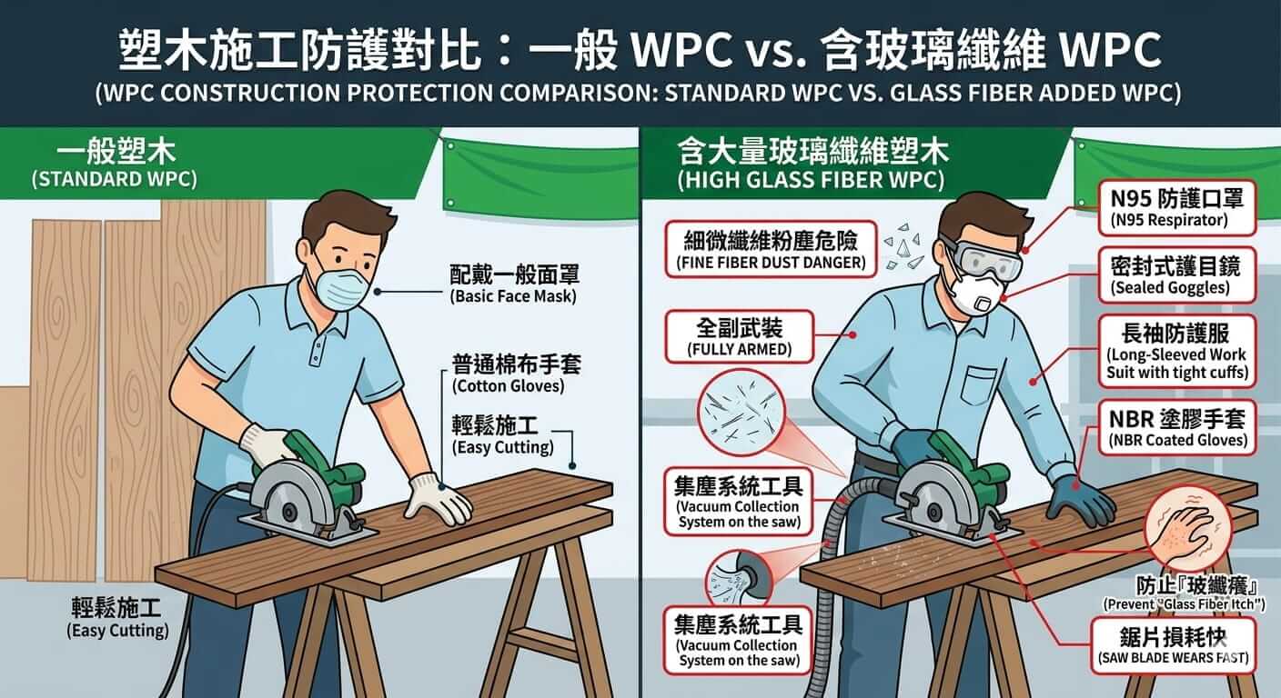 - 防護要求高: 處理含玻纖的材料需要更高等級的 N95 口罩與長袖防護衣,而一般的 WPC(木粉+PE)粉塵雖然也需防護,但相對不具備「穿透性」的物理刺激。